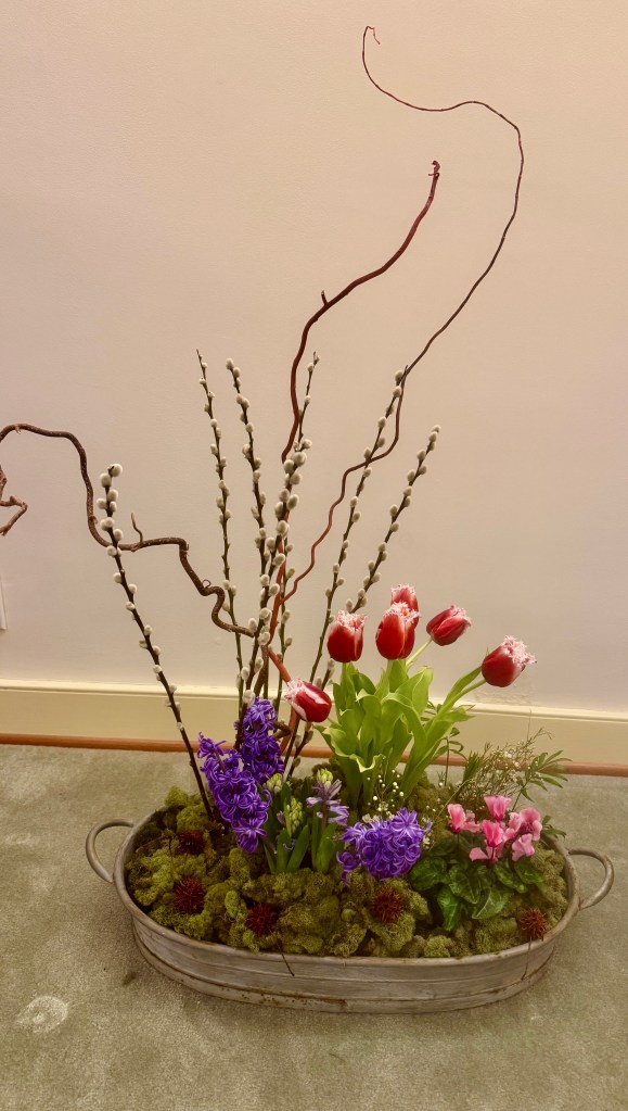 Exhibits: CLASS: Mantle Arrangement for Easter,accessories encouraged, medium. OPEN: Topiary Design celebrating Spring, accessories allowed, medium.