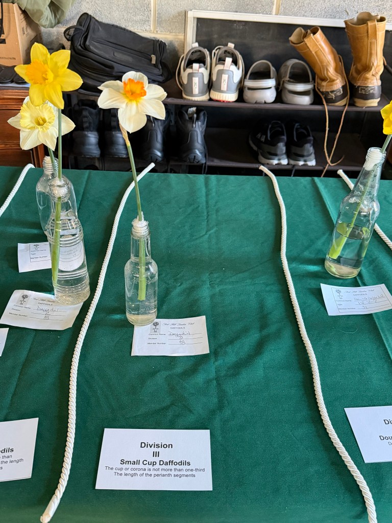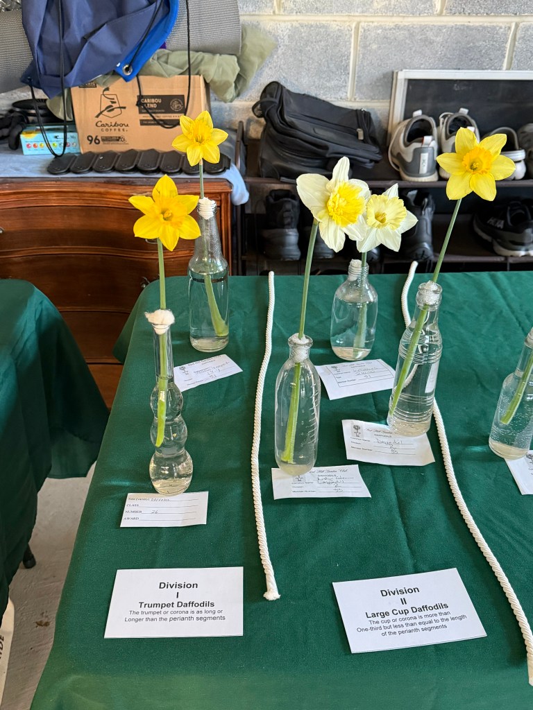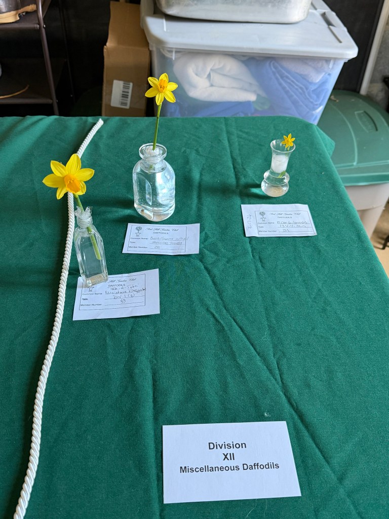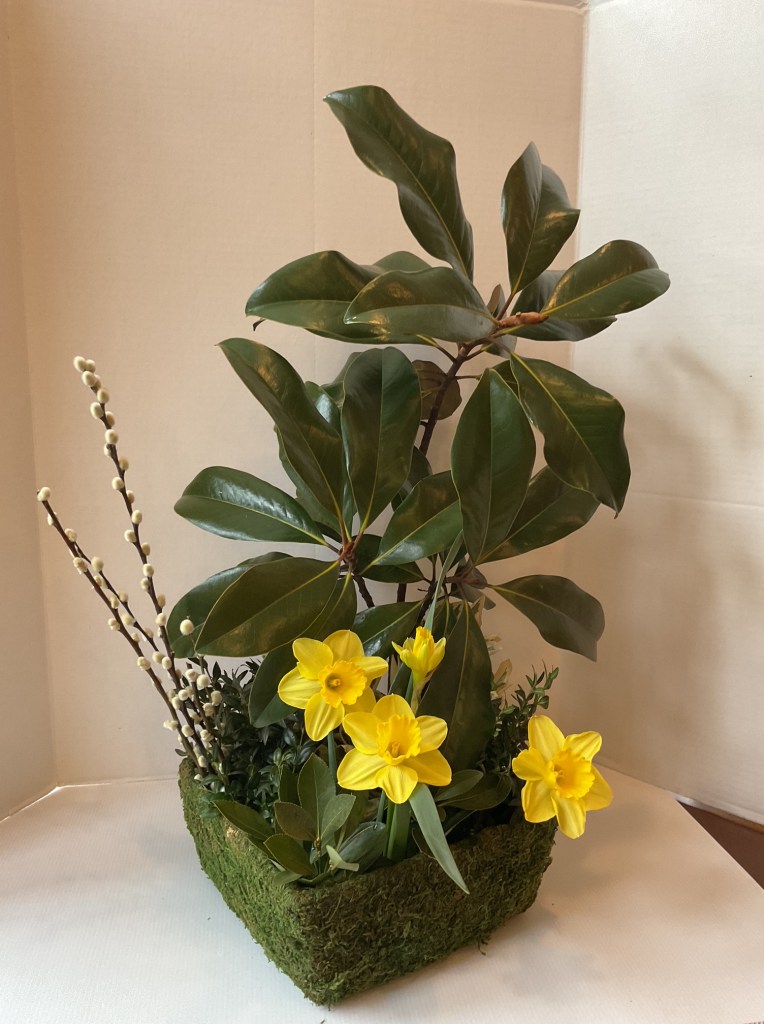 Exhibits – CLASS: Spring Floral Mass in a nest-like container (i.e., basket with a handle); accessories encouraged; no height requirement. OPEN: Daffodil Medium Mass Arrangement in a Blue/and White container.