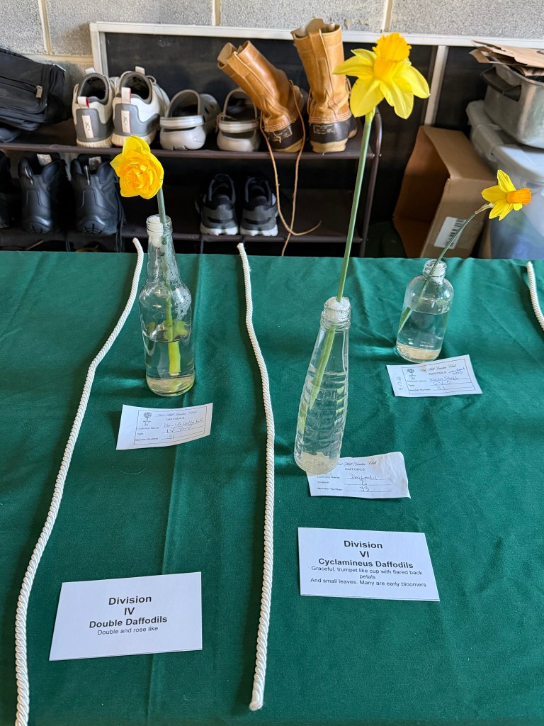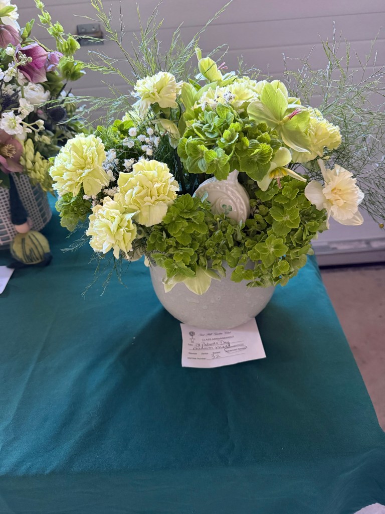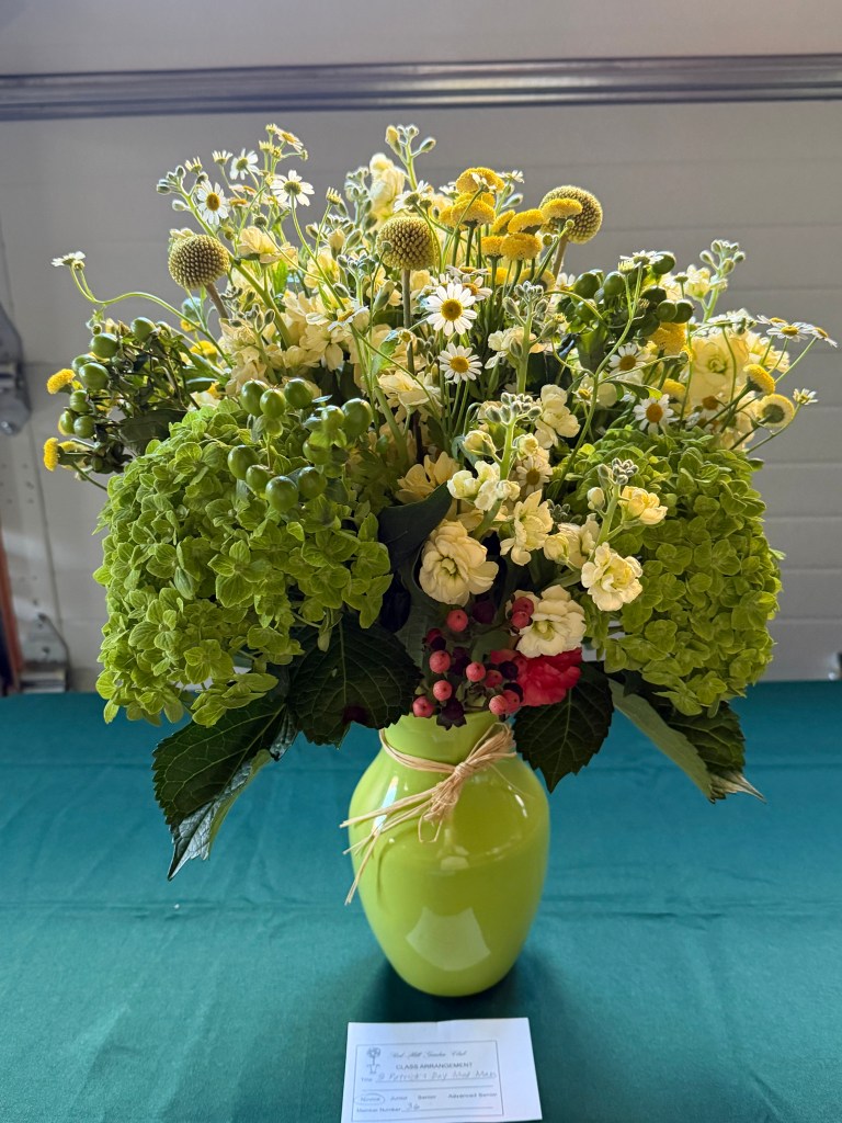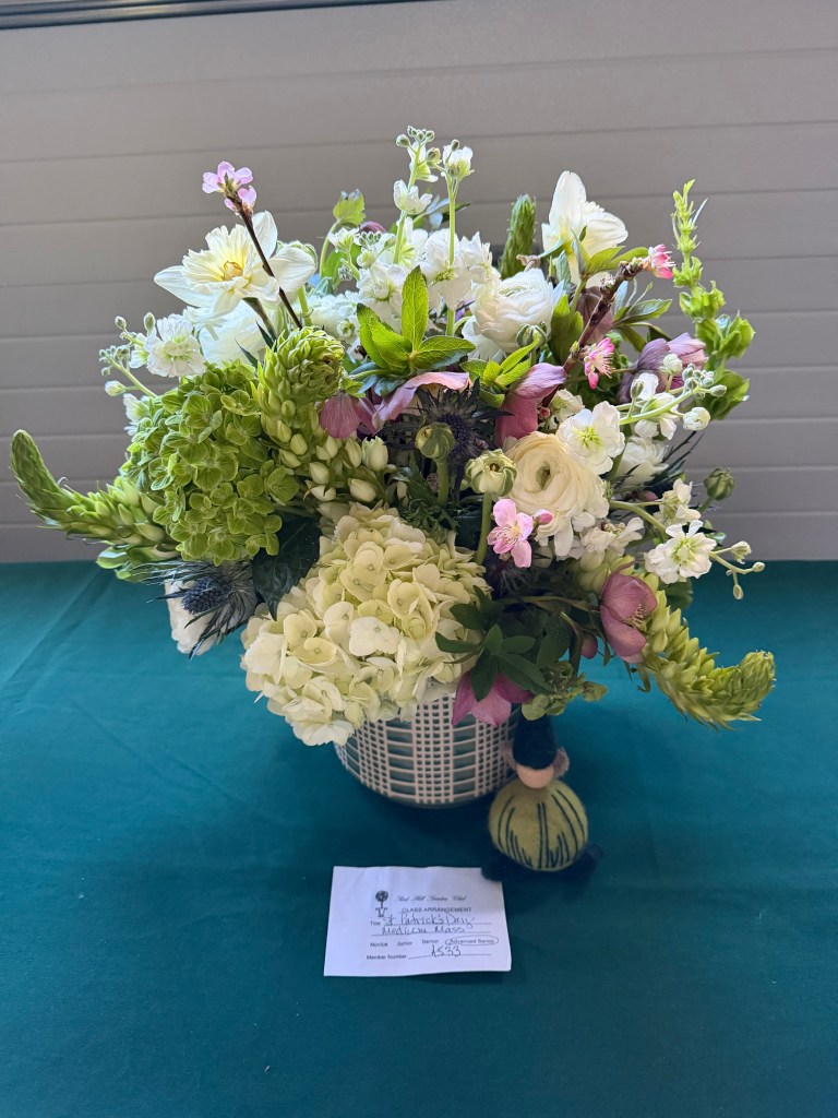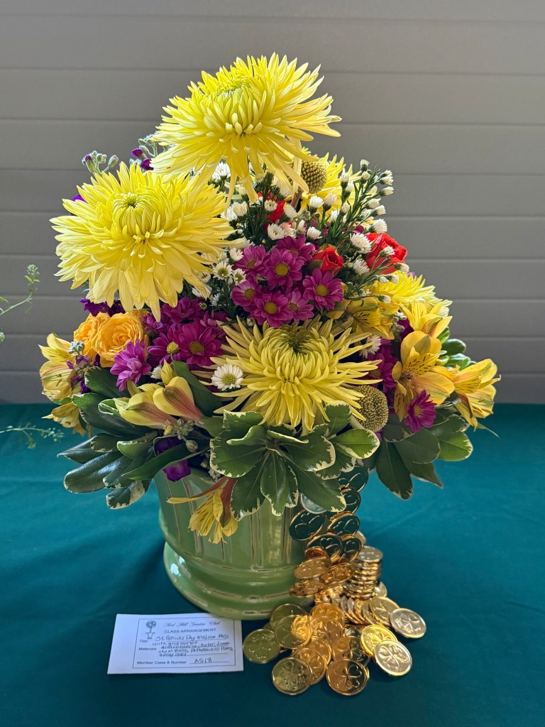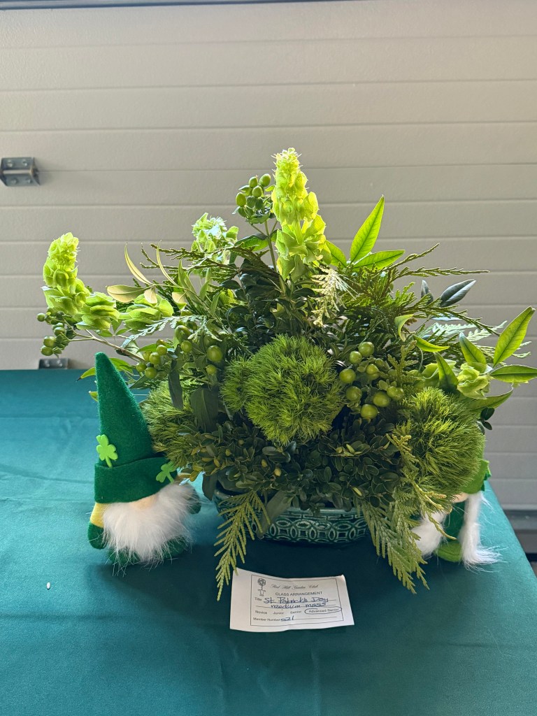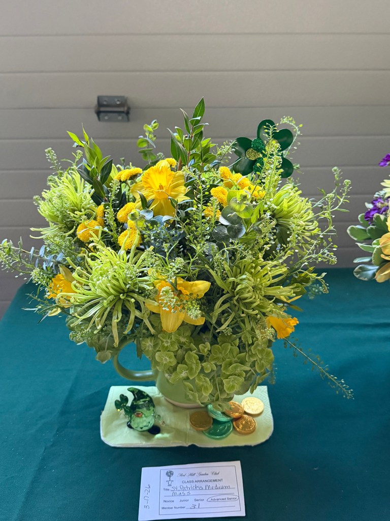 Exhibits: CLASS: Biedermeier Arrangement with daffodils and greens, medium. OPEN: Creative Line for St. Patrick’s Day, accessories allowed, medium.