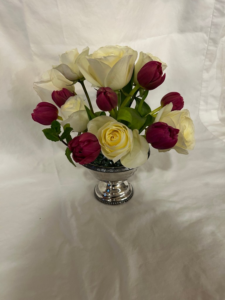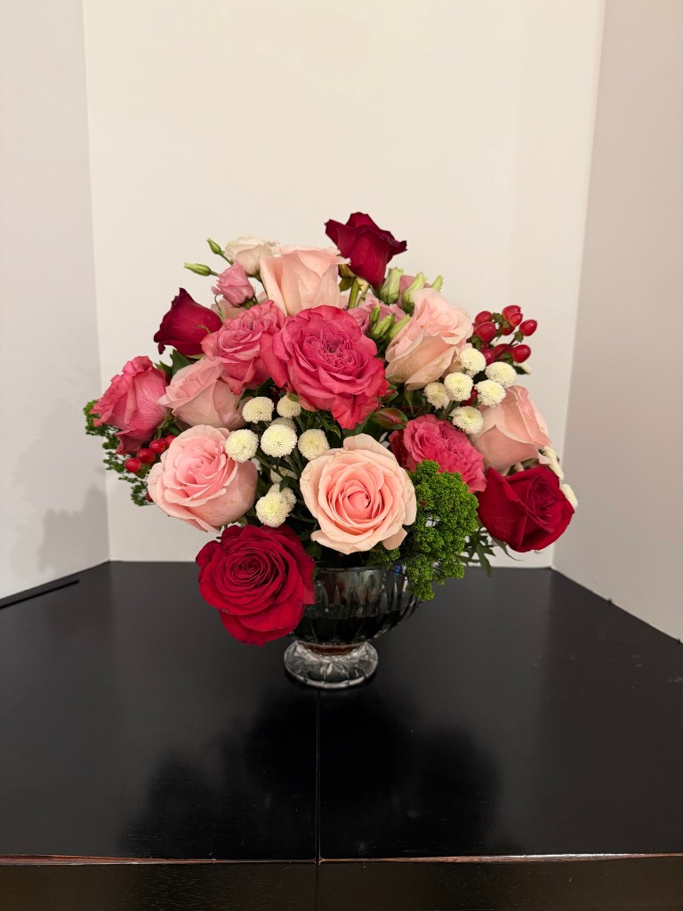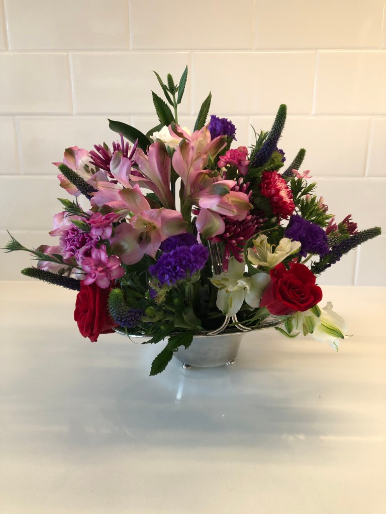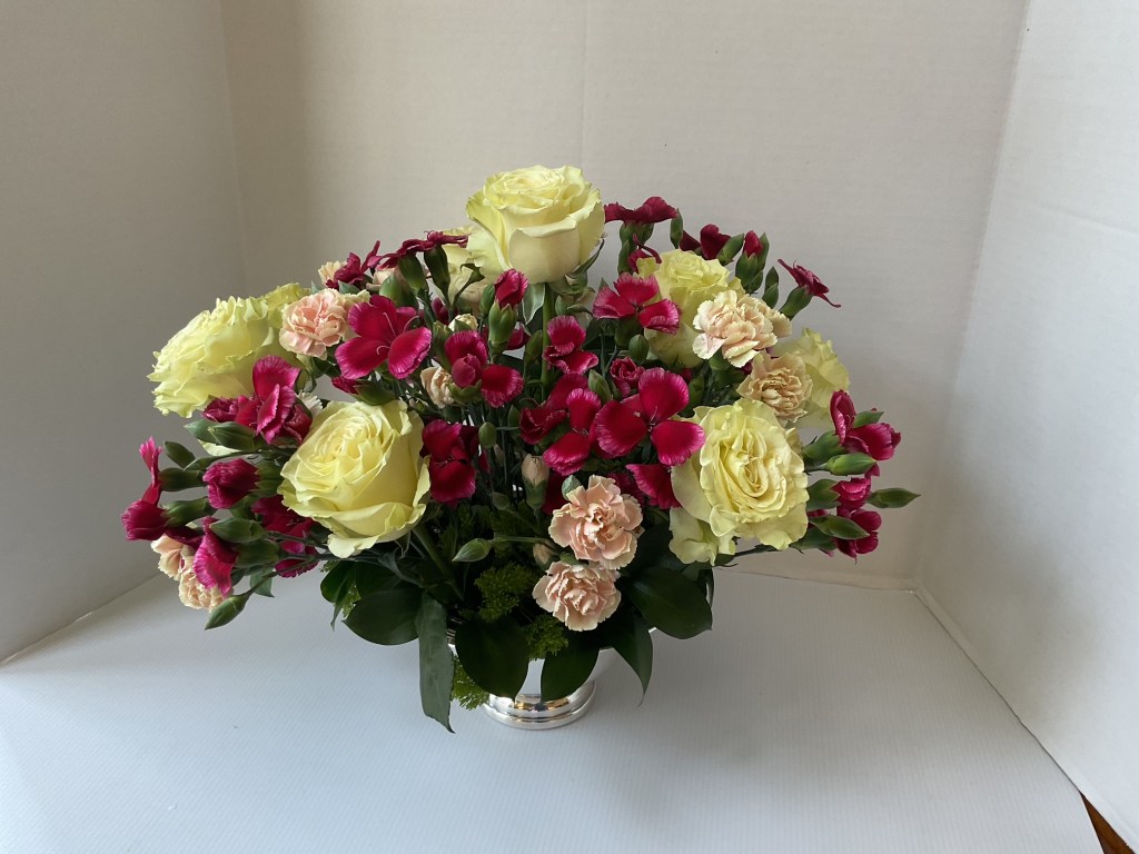 Exhibits: Virtual CLASS: Large Landscape Design (18″+) OPEN: Tradional Mass Valentines Day Arrangement/Medium in a silver or crystal bowl; medium (8-18″)
